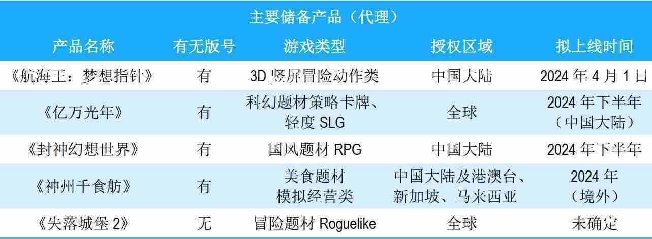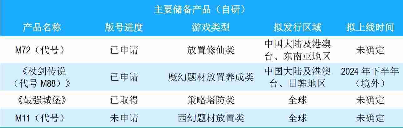 公司储备的多个自研、、、代理产品都在有序推进当中,,,,涵盖放置类、、、、策略类、、、、模拟经营类、、、RPG、、、Roguelike等多元化游戏品类,,储备的主要自研和代理产品如下::::